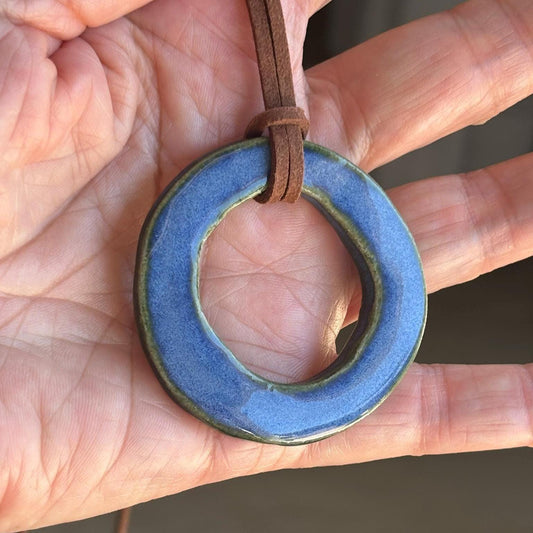 Blue Ceramic Ring Pendant Necklace: Handmade Stoneware Jewelry